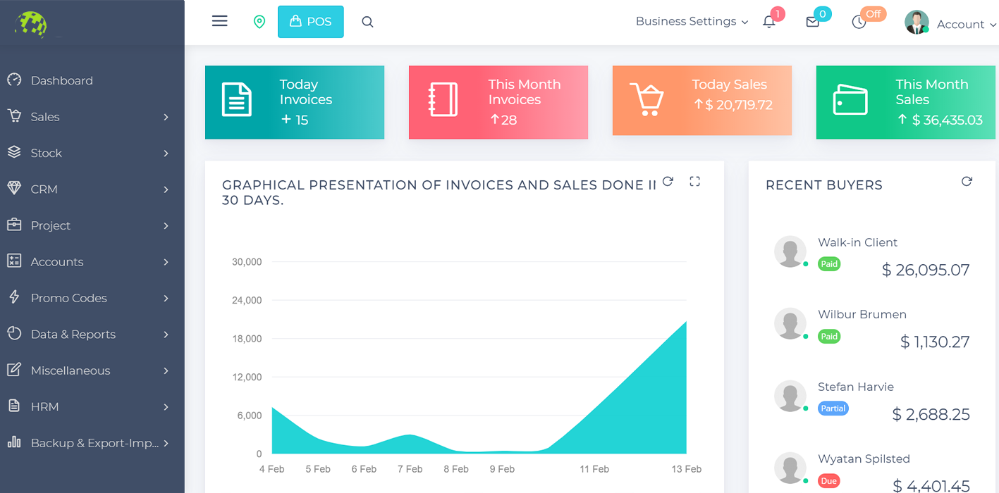 EBS is a Well Designed Complete Point Of Sale Solution With CRM, Accounts, HRM and Stock Manager. The application is packed with tons of features like GST, Multiple Business locations Invoicing, Quotations, Purchase Orders, Inventory Management, Customer Management, Supplier management, Project Management, Accounts, Data & Reports, REST API, CORN JOBS, Employee Management with distinct user roles and multiple payment currencies.